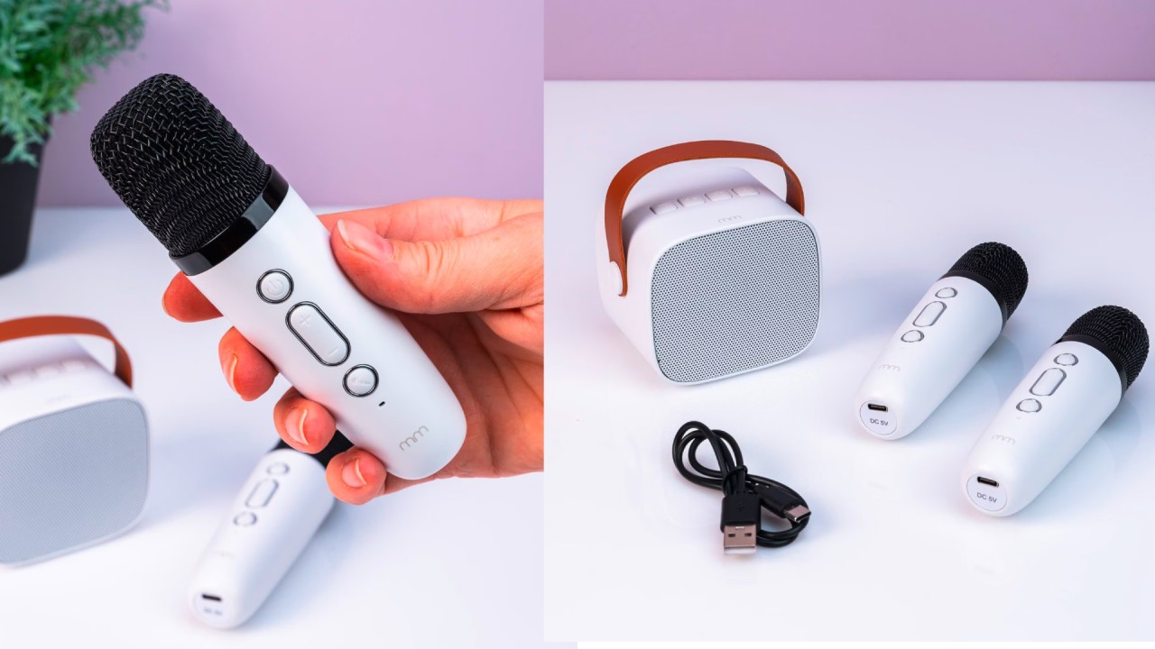 Setul compact include 2 microfoane fără fir, un difuzor HIFI puternic de 6 wați și oferă 5 efecte sonore unice pentru și mai multă distracție: modul ecou, modul baby, modul chipmunk, modul voce gravă și modul monstru.