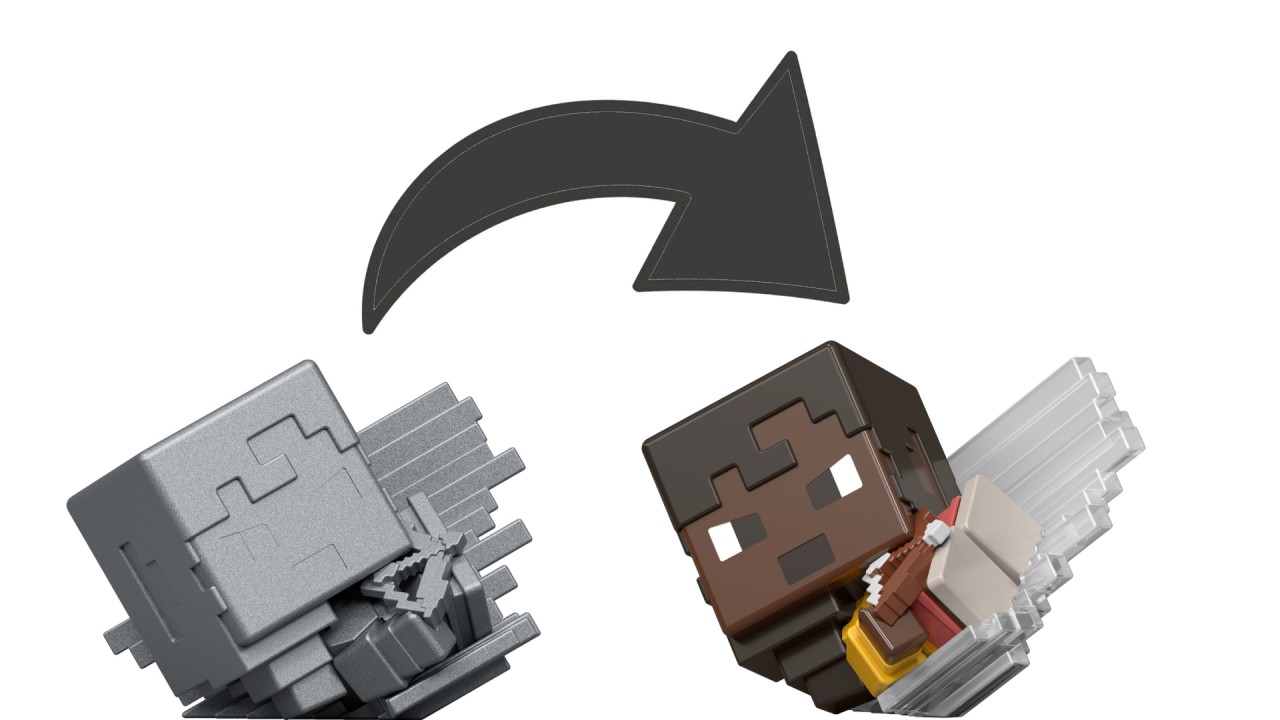 Figura are o postură dinamică și păstrează estetica pixelată distinctă Minecraft, oferind familiaritate fanilor seriei.