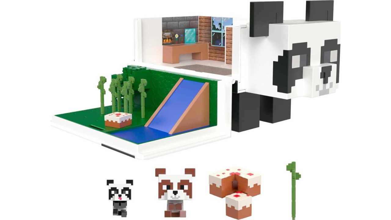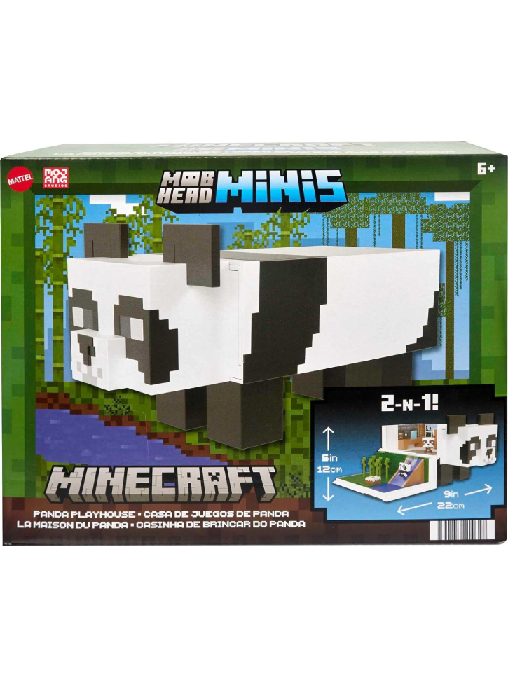 Fă-ți o casă în acest set de joacă Minecraft Mob Head Mini Panda Playhouse cu o casă cu 2 etaje și 2 figurine panda.