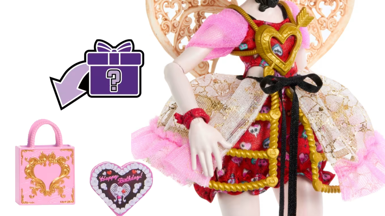 The themed party accessories are preparing the scene for a sweet and frightening birthday, such as a bag of toys for Draculaura with a surprise gift inside. An invitation, a balloon and a birthday greeting card is also included.