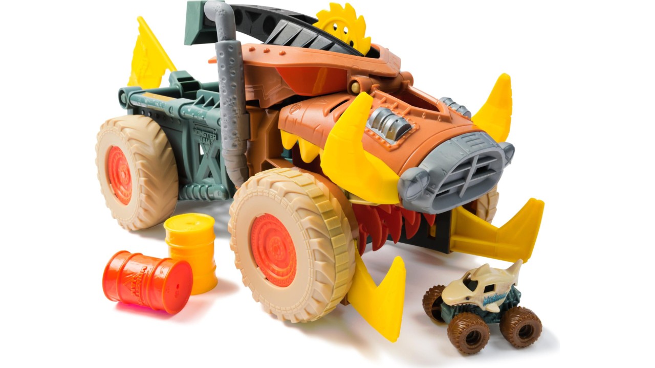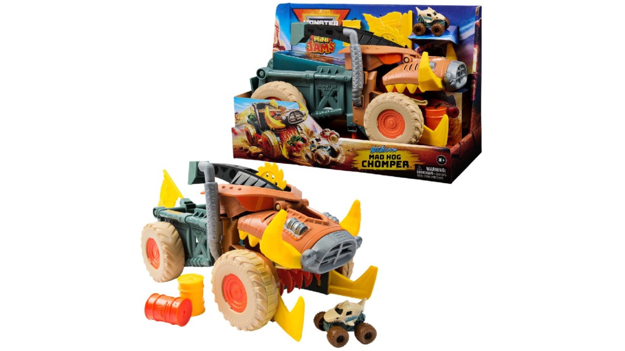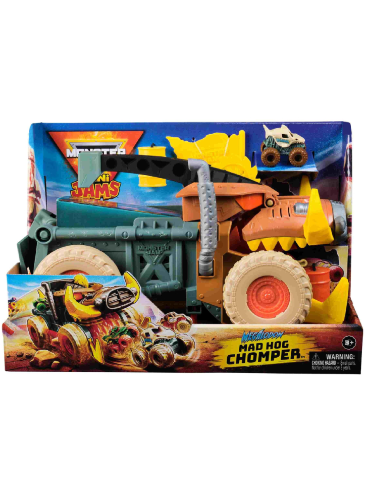 Experimentează entuziasmul în timp ce uriașul Megalodon Mad Hog ronțăie și ridică toate camioanele și butoaiele Mini Jams din calea sa.