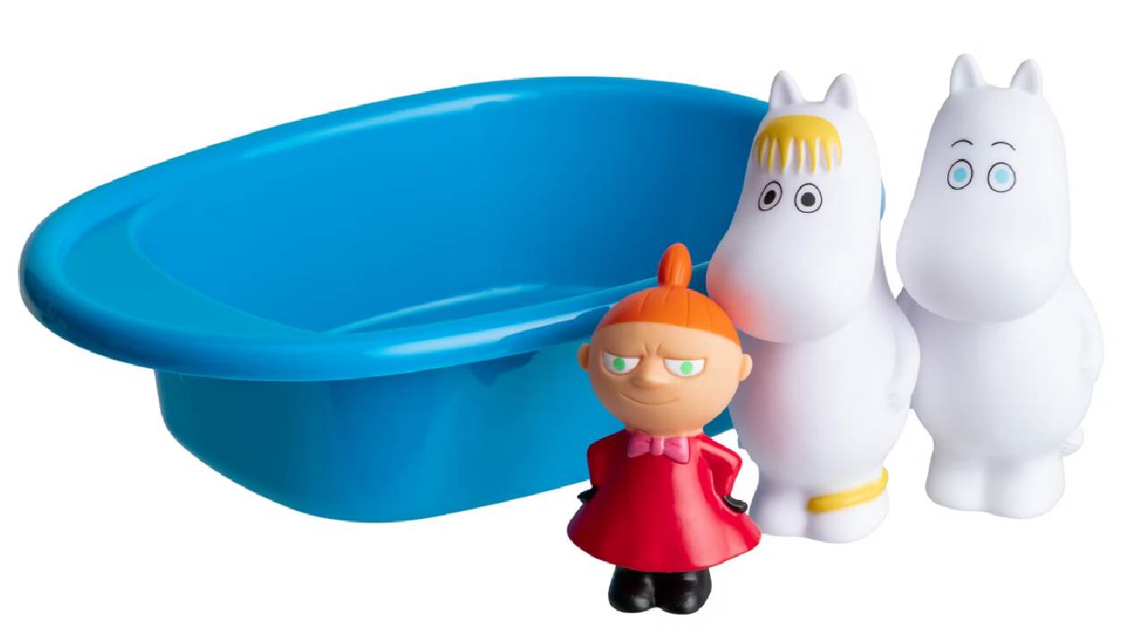 Un set de jucării pentru baie Moomin, care include o cadă mică din plastic și trei figurine: Moomintroll, Snorkmaiden (Niiskuneiti) și Little My (Pikku Myy).