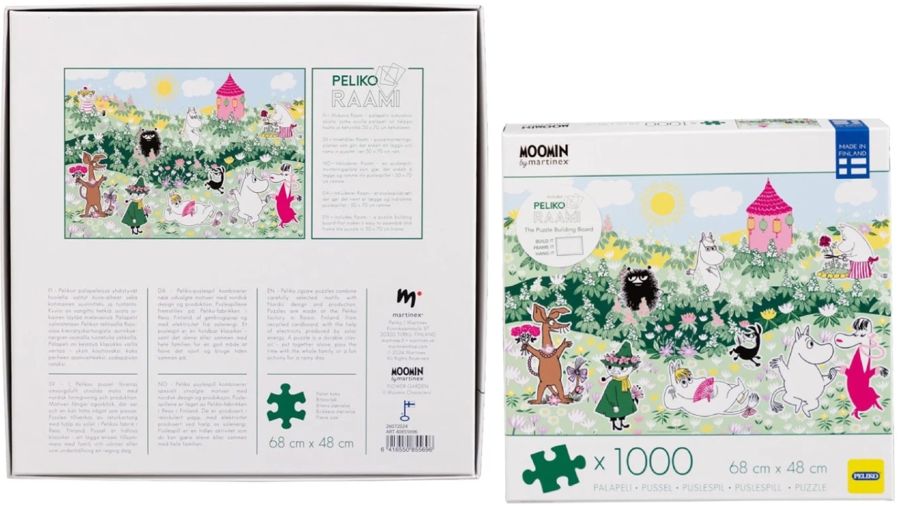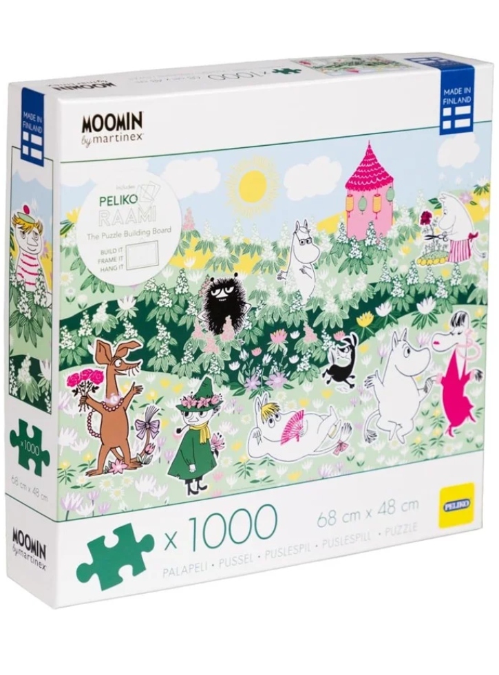 The Moomin floral themed puzzle features a print of Moomin characters enjoying a lush garden with flowers.