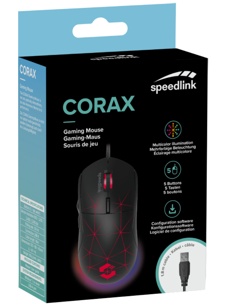 Mouse-ul de gaming cu fir Speed Link Corax adaugă arsenalului tău de gaming o rezoluție de 3.200 DPI, 5 butoane și iluminare RGB.