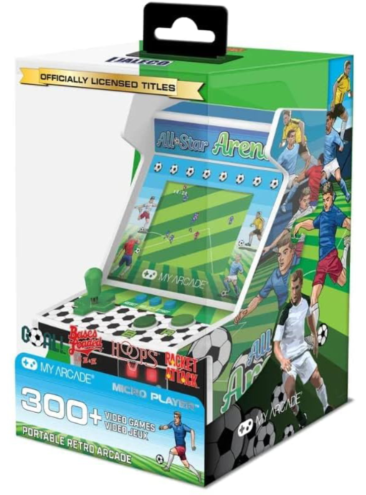 My Arcade All-Star Arena Micro Player este un mic aparat arcade portabil complet jucabil de 6,75 inci cu 307 jocuri retro și un ecran de 2,75 inci cu afișaj color.