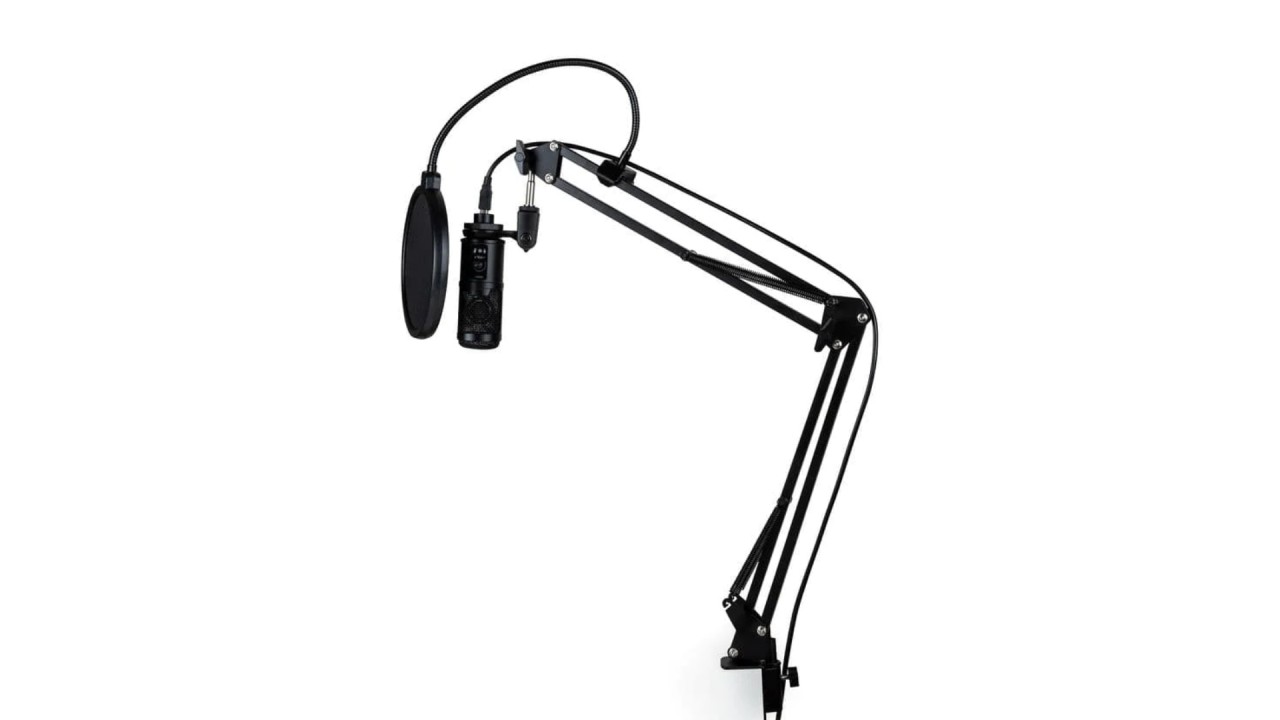 Adjustable articulated metal arm with 360 degree rotation. Adjustable and removable filter to be positioned on the arm, which reduces breathing noise and protects the microphone without distorting the sound.