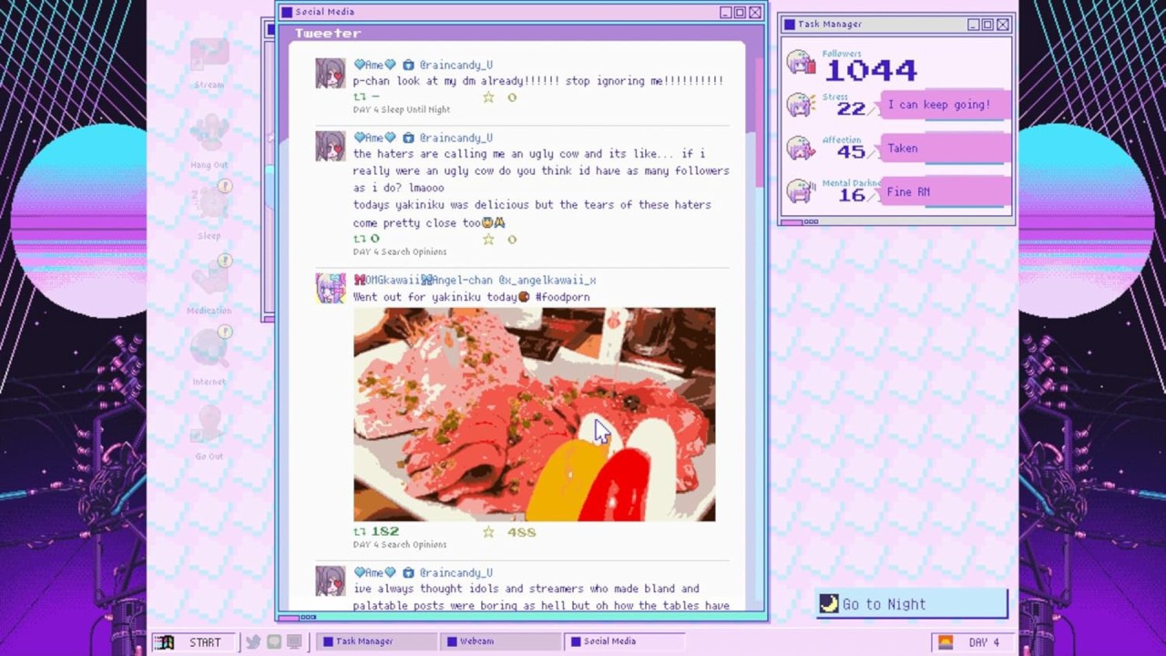 Construiți treptat numărul de urmăritori ai lui OMGkawaiiAngel, în timp ce ea își petrece zilele făcând streaming, folosind diverse substanțe antistres și, în general, fiind cam dată peste cap.
