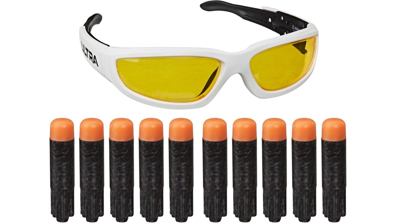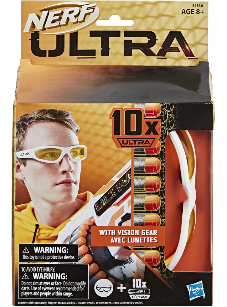 Pregătește-te pentru acțiune cu ochelarii Nerf Ultra Vision Gear incluși în acest pachet de reîncărcare cu săgeți.