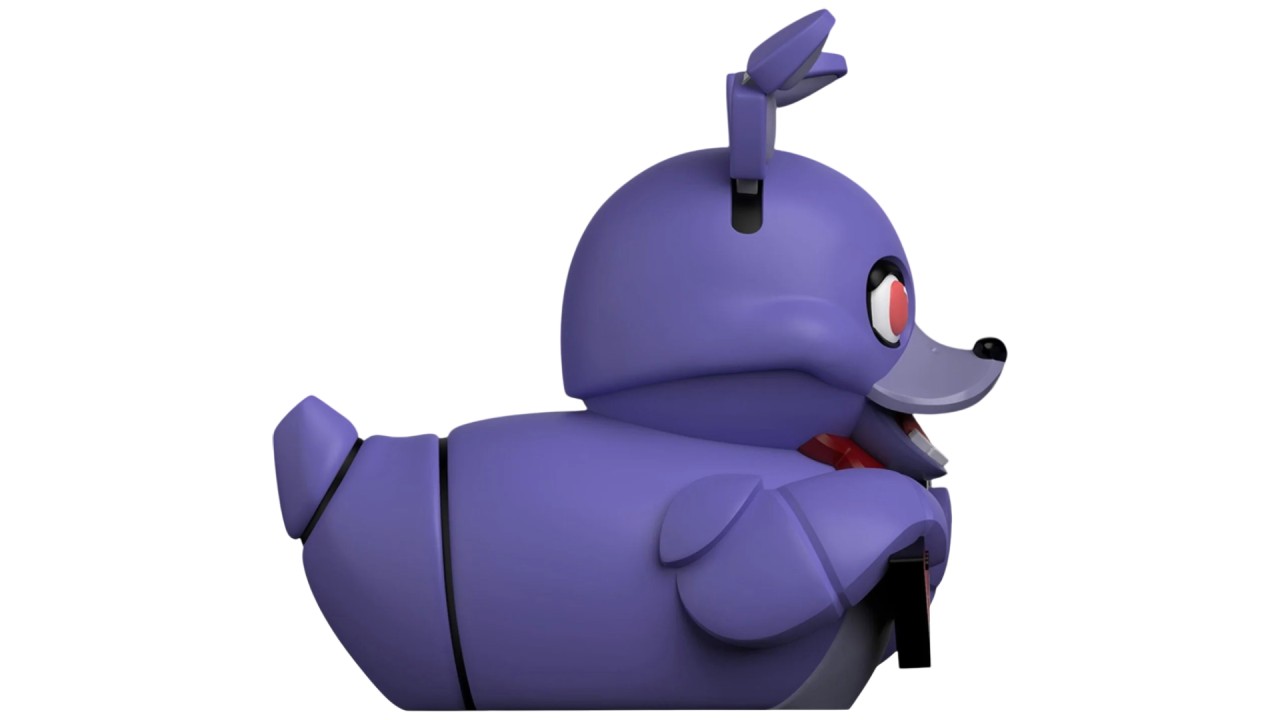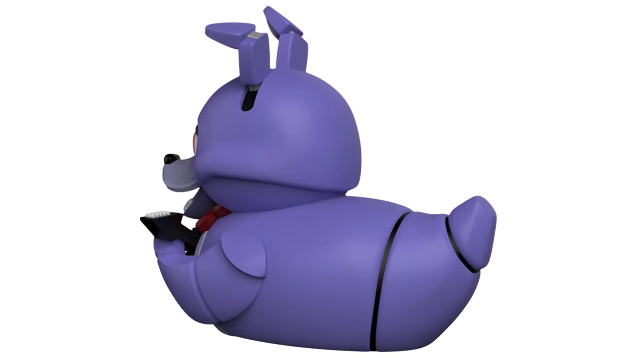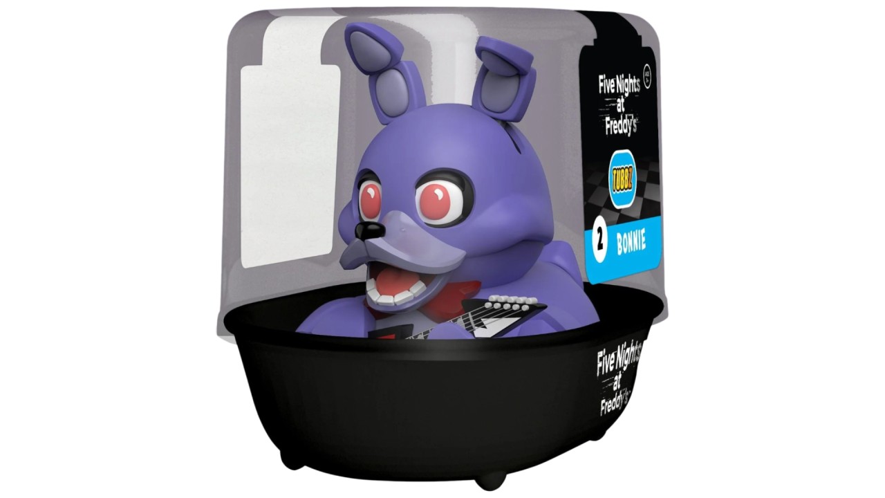 Vine într-o cadă de colecție, cu logo-ul Five Nights at Freddy's, „First Edition” imprimat pe baza raței și autocolant pe ambalaj.