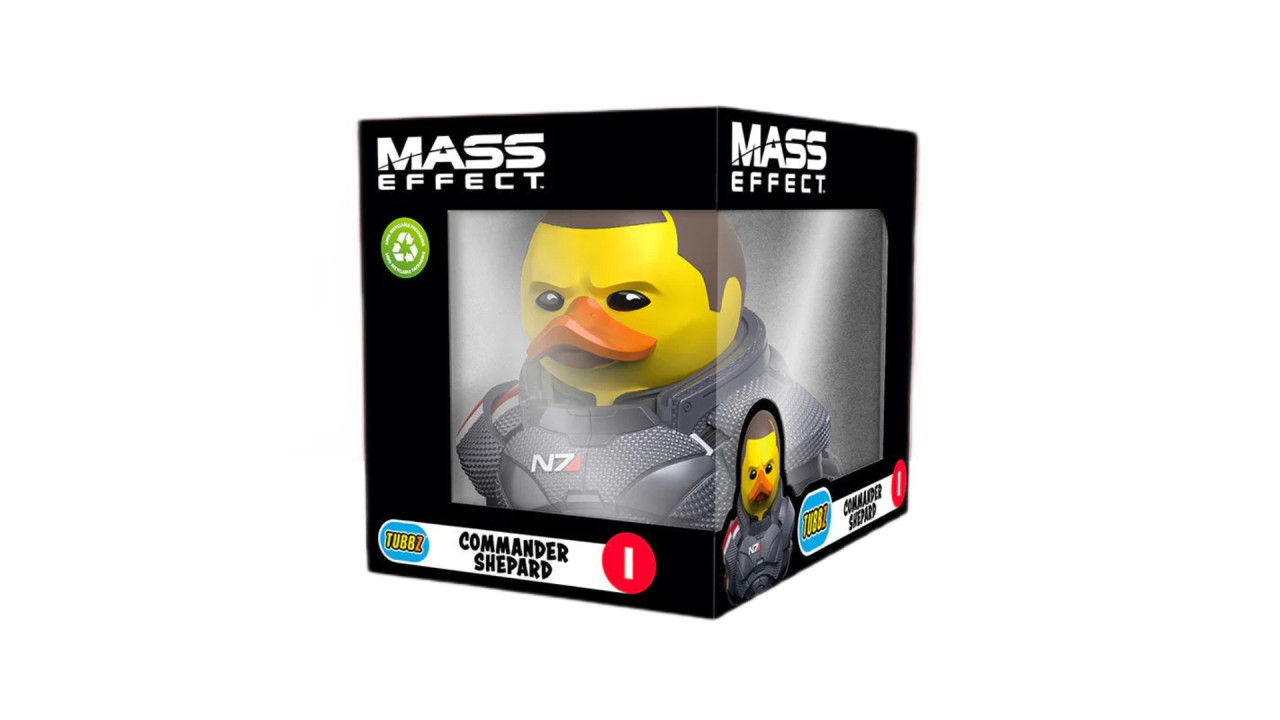 The figure depicts Commander Shepard, the main character of the "Mass Effect" series, in a stylized and cute duck-like form.