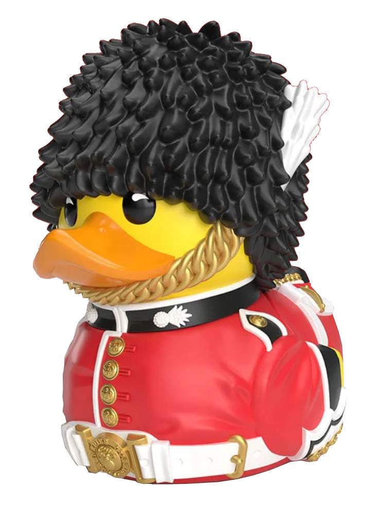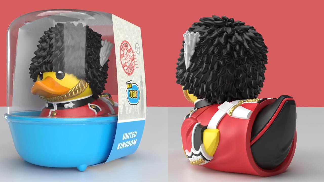 Presented in a mini themed bathtub, this small protector is a strange accessory for fans of British tradition or anyone appreciating a discipline duck.