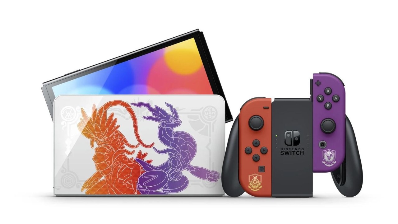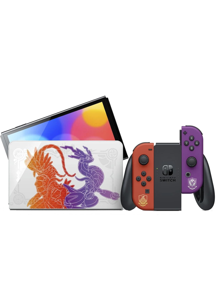 Modelul Nintendo Switch - OLED: Pokémon Scarlet & Violet Edition prezintă ilustrații speciale ale Pokémonilor legendari care apar în jocurile Pokémon Scarlet și Pokémon Violet, Koraidon și Miraidon, precum și ale Pokémonilor parteneri Sprigatito, Fuecoco și Quaxly.