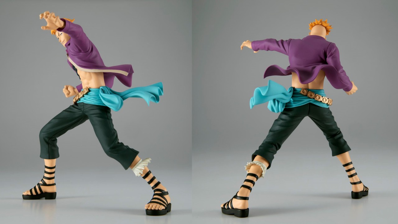 Îmbrăcat în cămașa sa iconică violetă deschisă, care îi dezvăluie toracele tatuat, și pantaloni negri cu o centură decorată cu detalii aurii, Marco este reprezentat cu mare fidelitate față de detaliile manga-ului.
