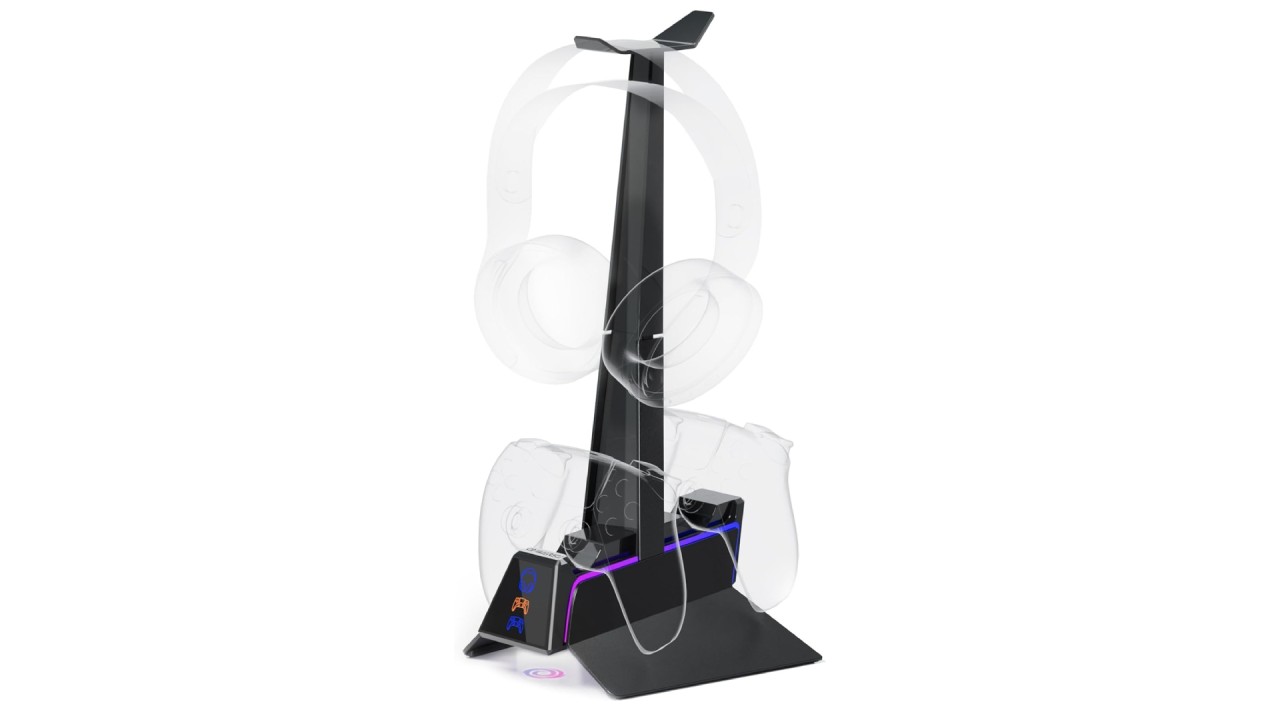 Suportul pentru căști inclus vă permite să păstrați toate accesoriile într-un singur loc, eliberând spațiul de joc.