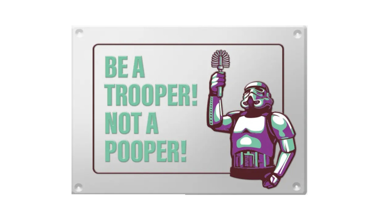 Semnul îl prezintă pe Stormtrooperul original care ține în aer o perie de toaletă ca pe un sceptru.