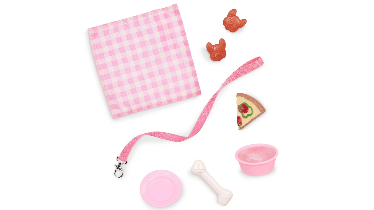 Include: păpușă, bluză, fundiță de păr, jambiere cu amprenta labei, o pereche de chiloți, pantofi, pluș de câine Labradoodle, zgardă, lesă atașabilă, o felie de pizza, 2 dulciuri pentru câine, pătură de picnic, o farfurie, bol de apă și os de jucărie.