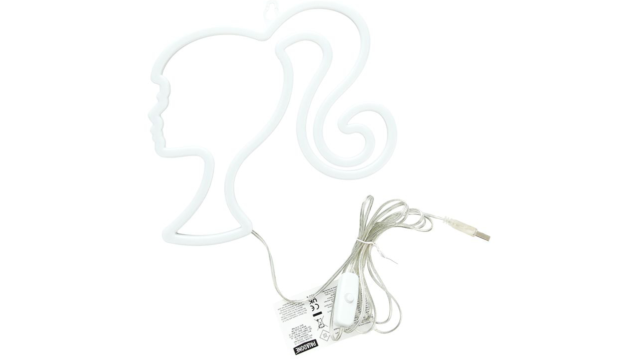 Lumina care poate fi montată pe perete, are forma profilului lateral iconic al lui Barbie, cu coada ei de cal înaltă caracteristică.