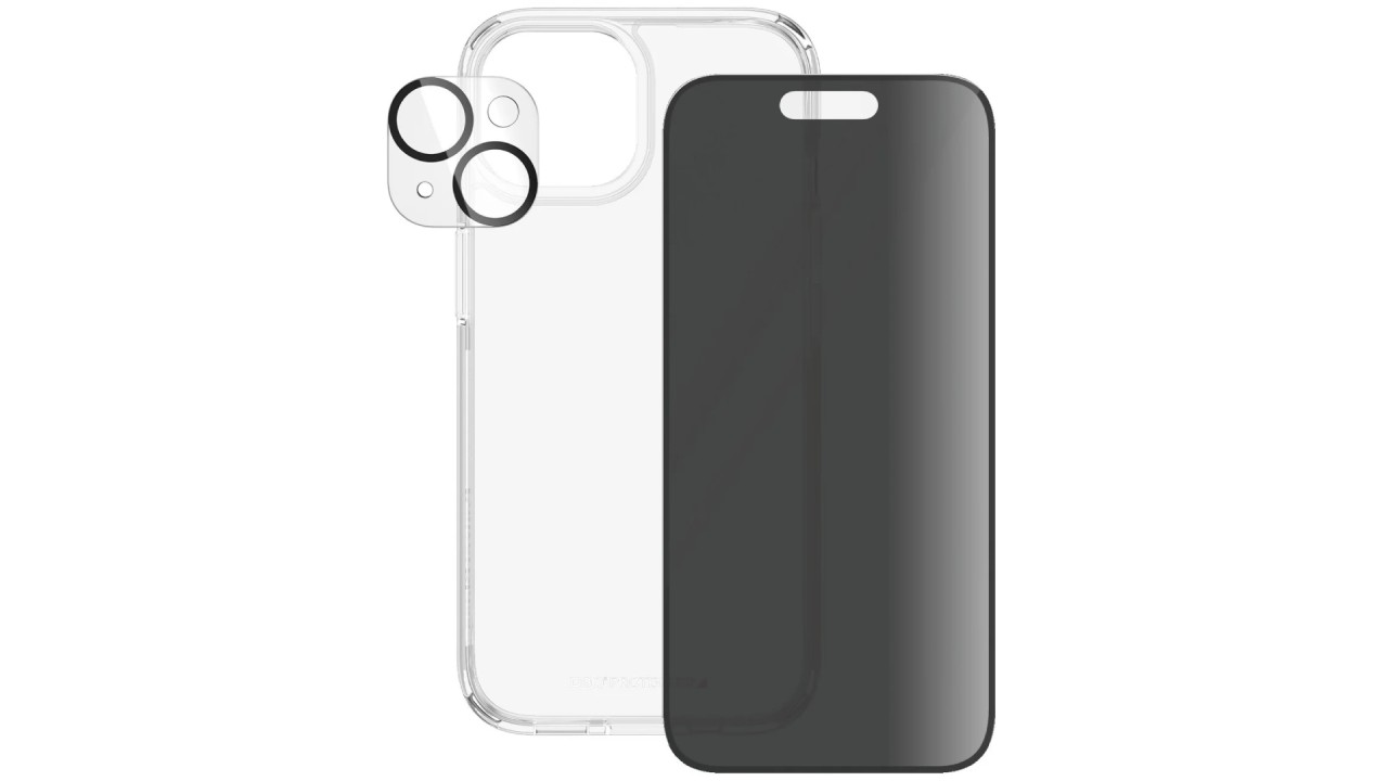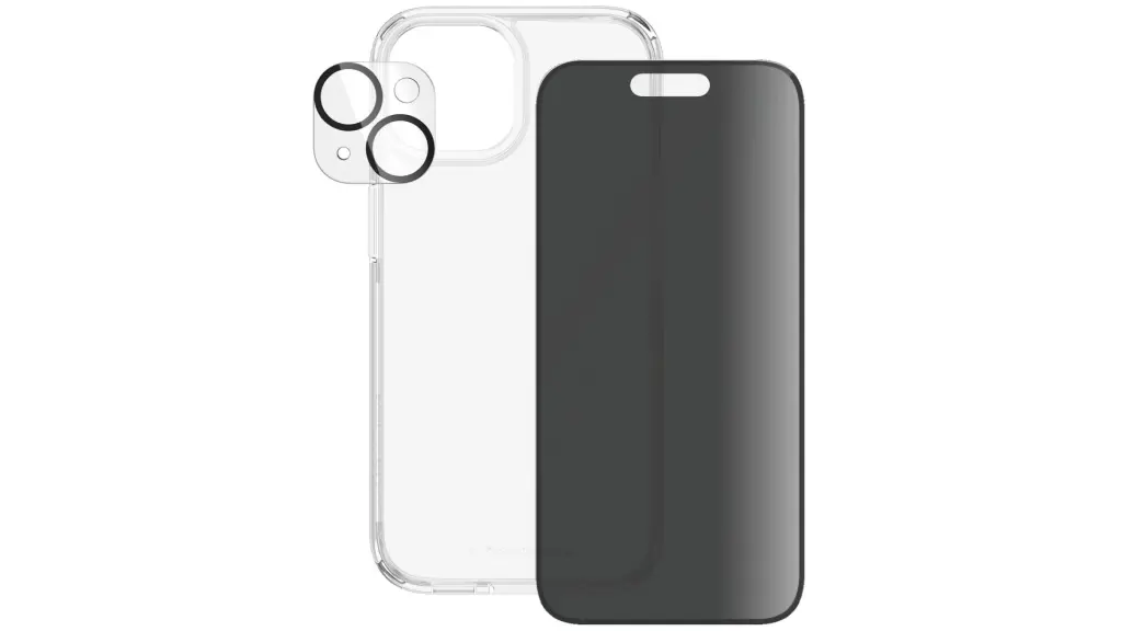 Acest pachet 3-în-1 de la PanzerGlass include: un protector pentru lentila camerei, o carcasă și un protector de ecran.