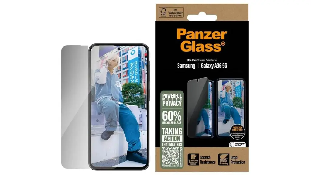 - Panzerglass screen protection for privacy, made of 60% recycled glass