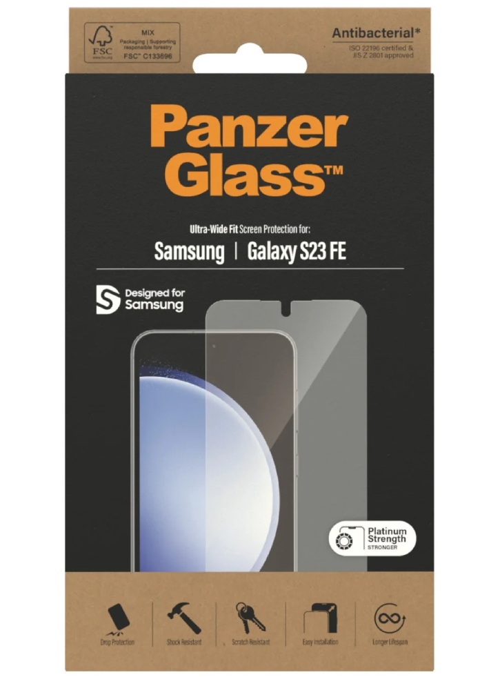 Folia PanzerGlass Ultra-Wide Fit este fabricată din sticlă temperată transparentă, rezistentă ca platina, care păstrează aspectul și senzația originale ale telefonului Samsung Galaxy S23 FE.