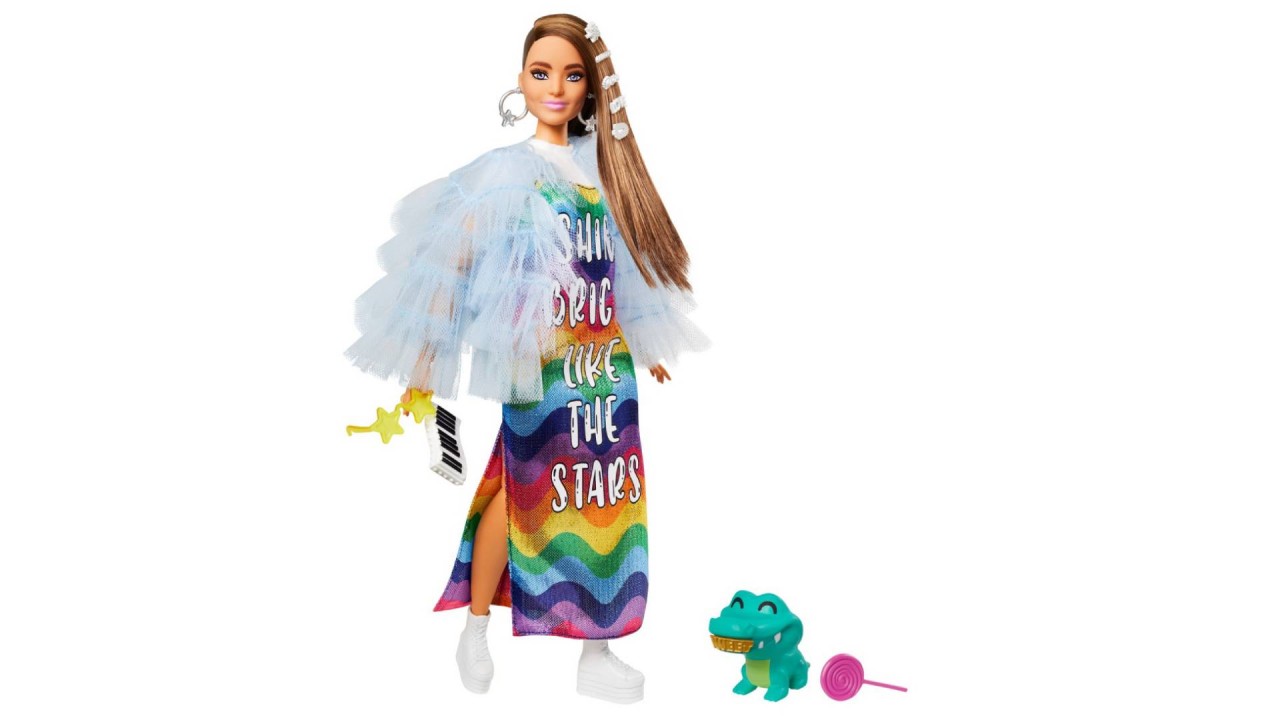 Accesoriile păpușii Barbie, un ambreiaj în stil tastatură, bijuterii argintii, ochelari de soare în formă de stea și pantofi cu platformă albă îi oferă și mai multă expresie personală.