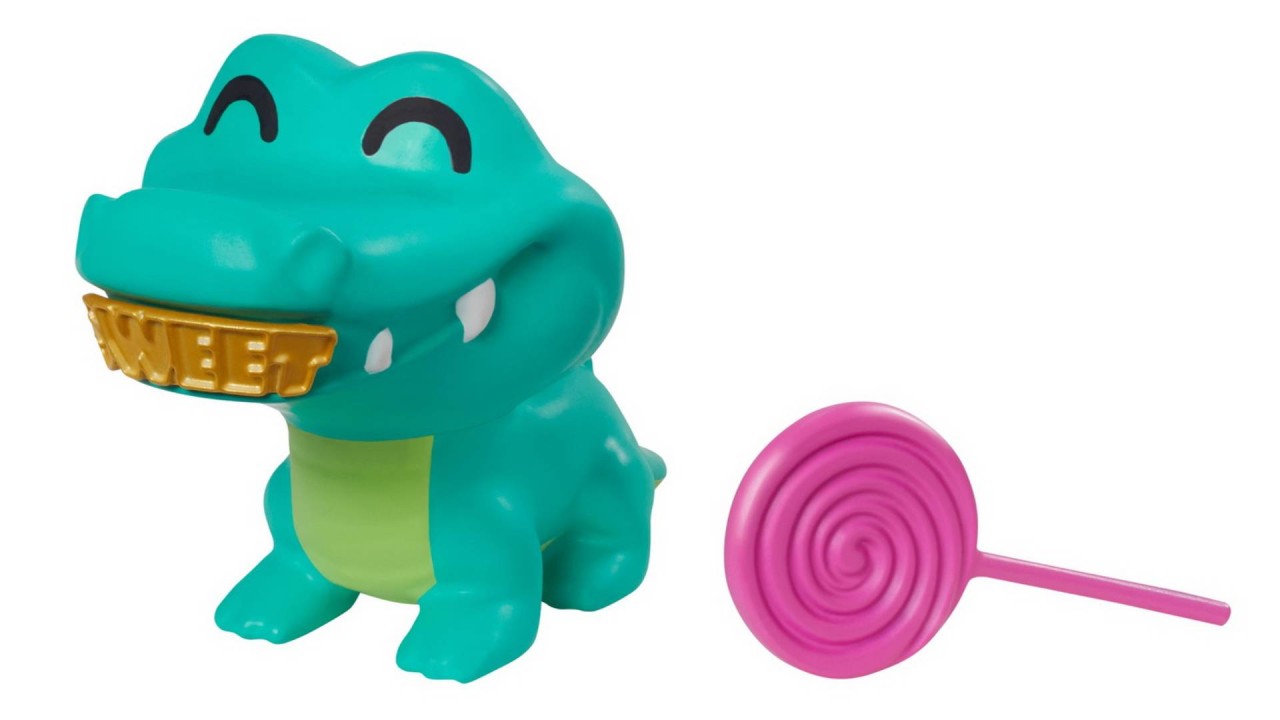 Figurina crocodilului ca animal de companie are dinți placați cu aur pe care drăguț și o recompensa sub forma de acadea.