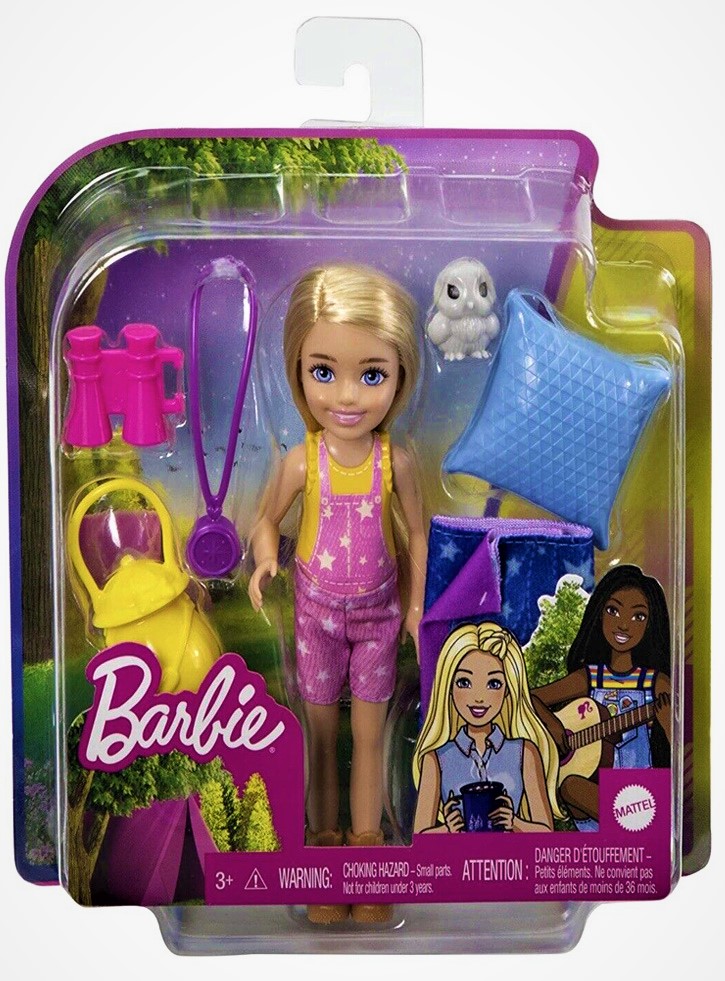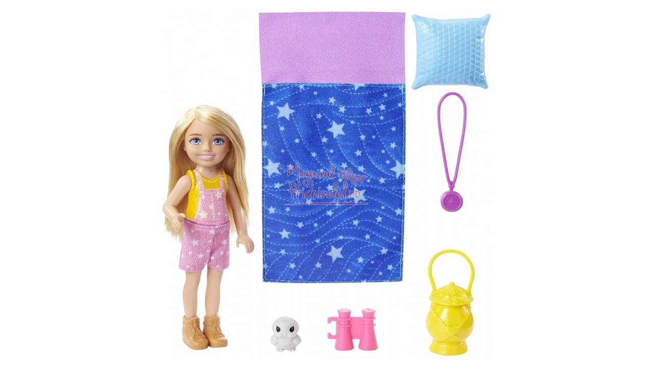 Imbracata cu salopeta roz cu imprimeu instelat, papusa Chelsea este pregatita pentru tot felul de distractii de camping.