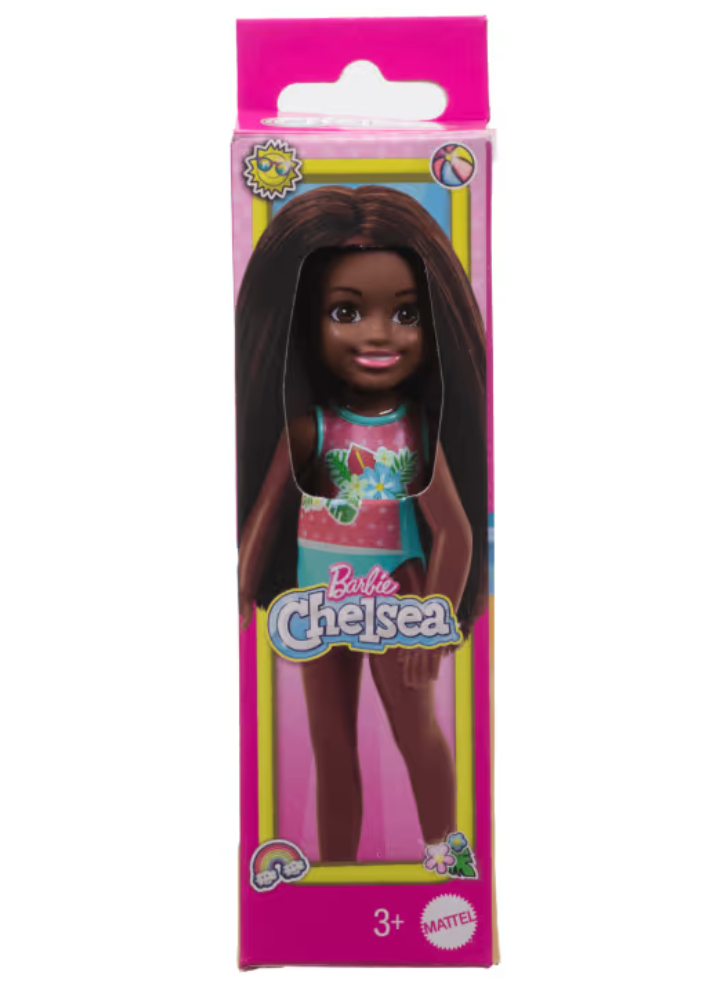 Costumele de baie ale păpușii Chelsea sunt decorate cu modele luminoase și grafică la modă.