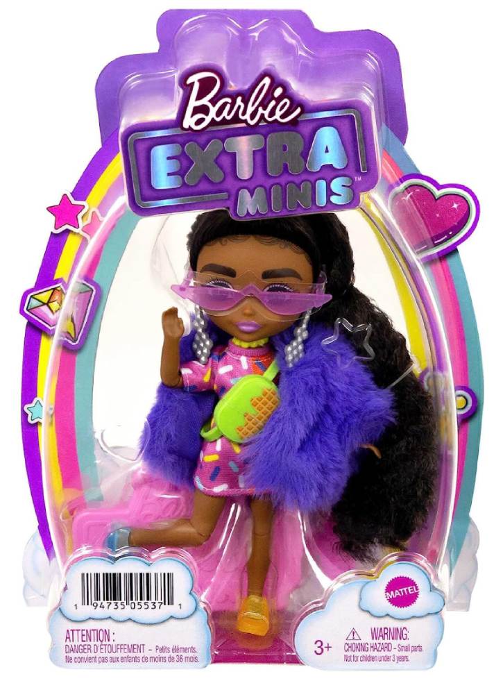 Această păpușă Barbie Extra Minis are părul ondulat și extra-lung, aranjat într-un top-bun, o rochie cu imprimeu cu stropi de curcubeu și o jachetă mov blănoasă care este atât de extra.