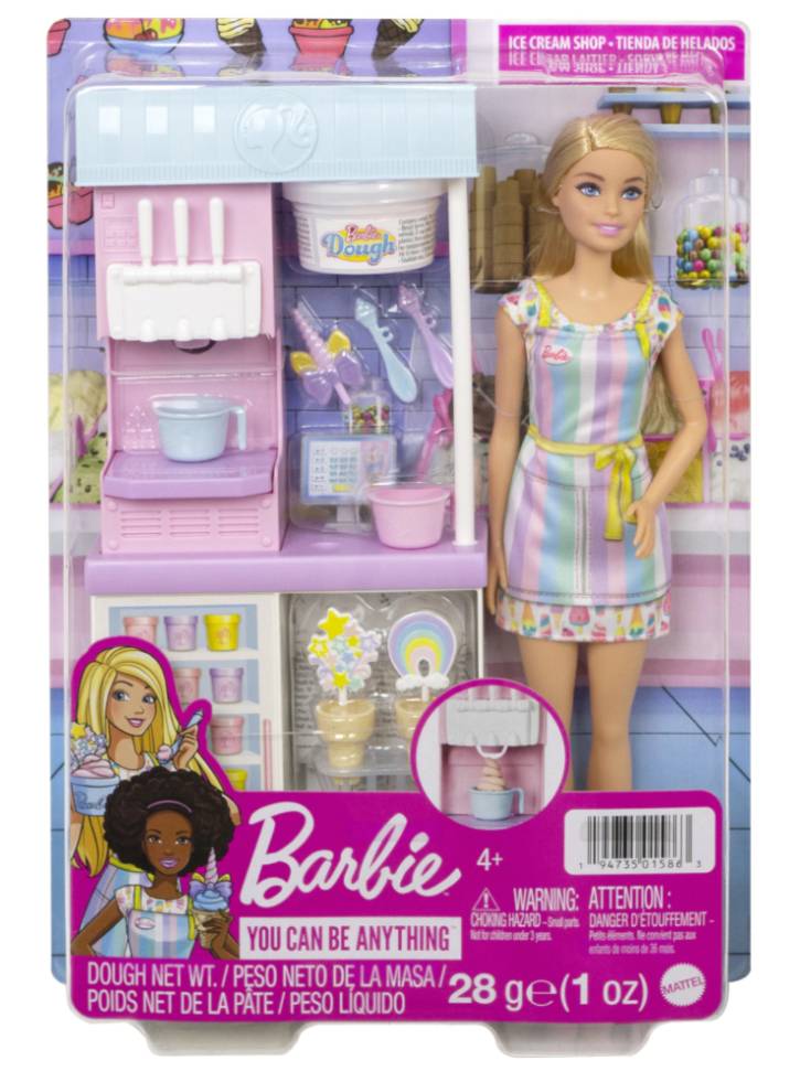 Pachetul include: o gelaterie, păpușa Barbie și accesorii pentru gelaterie: 2 culori de aluat, 2 boluri, 2 conuri, 3 topping-uri decorative, 2 linguri, suport pentru conuri și registru.