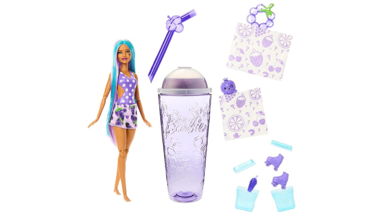 După despachetare, ies la iveală o păpușă Barbie mobilă cu parfum de grapefruit, un cățeluș squishy parfumat și accesorii asortate.