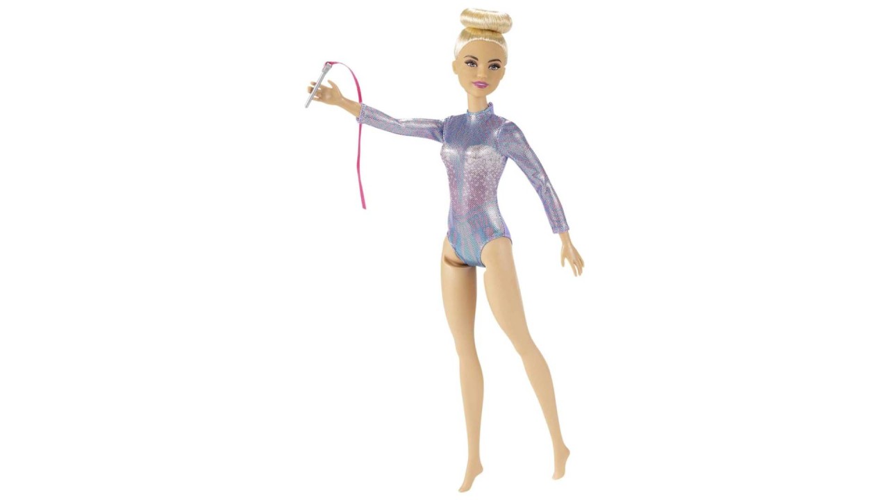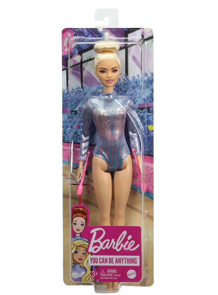 Purtând un tricou metalic colorat și un coc drăguț, păpușa Barbie gimnastă ritmică este gata să execute mișcări de gimnastă ritmică.