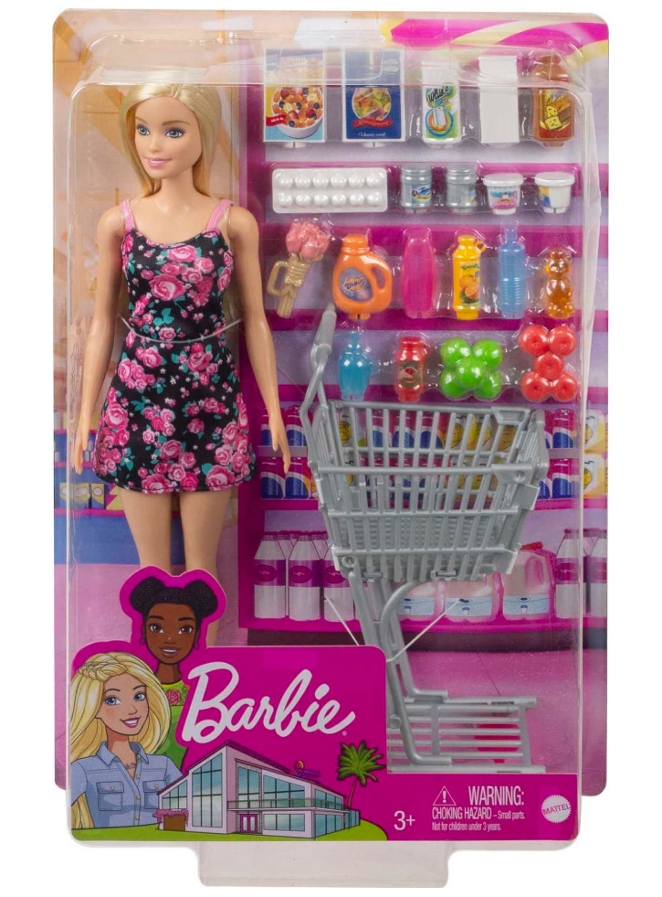Acest set de păpușă Barbie și set de cumpărături inspiră imaginația tinerilor să pună propria lor imagine pe o activitate de zi cu zi și să se joace de-a cumpărăturile la băcănie.