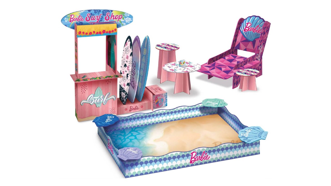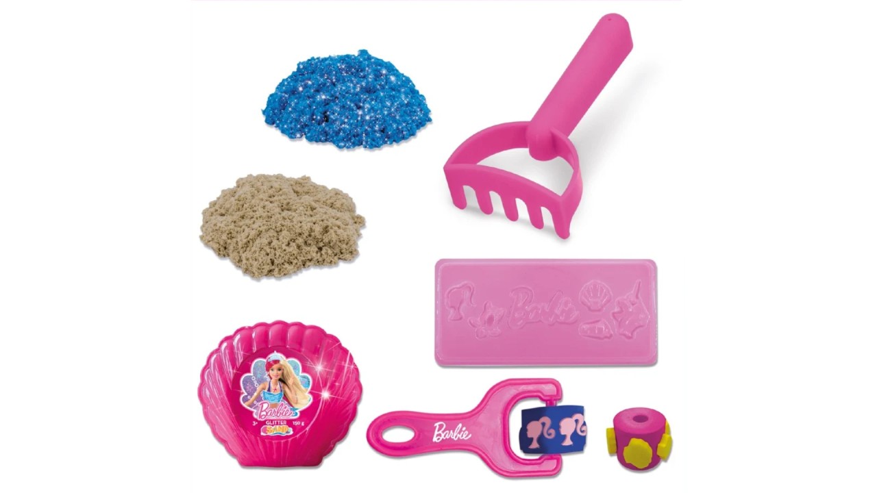 Include: păpușă Barbie, de nisip albastru strălucitor, de nisip natural colorat, cochilie Barbie, cutie de carton practică cu tematică marină, role în formă de Barbie și de cochilie , greblă de plajă.