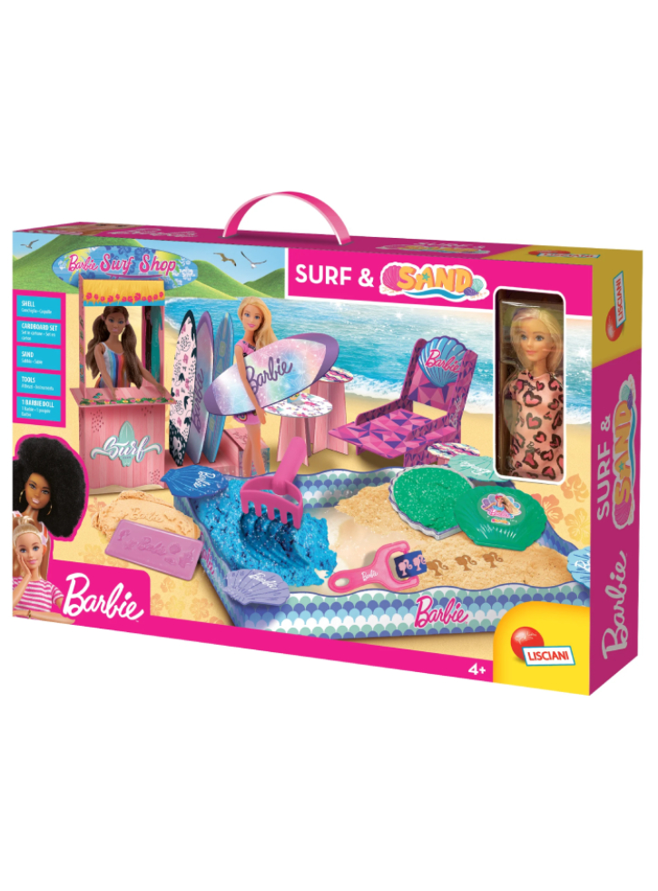 Transportă-ți păpușa Barbie pe o plajă fantastică cu păpușa Lisciani Barbie Surf & Sand With Doll.