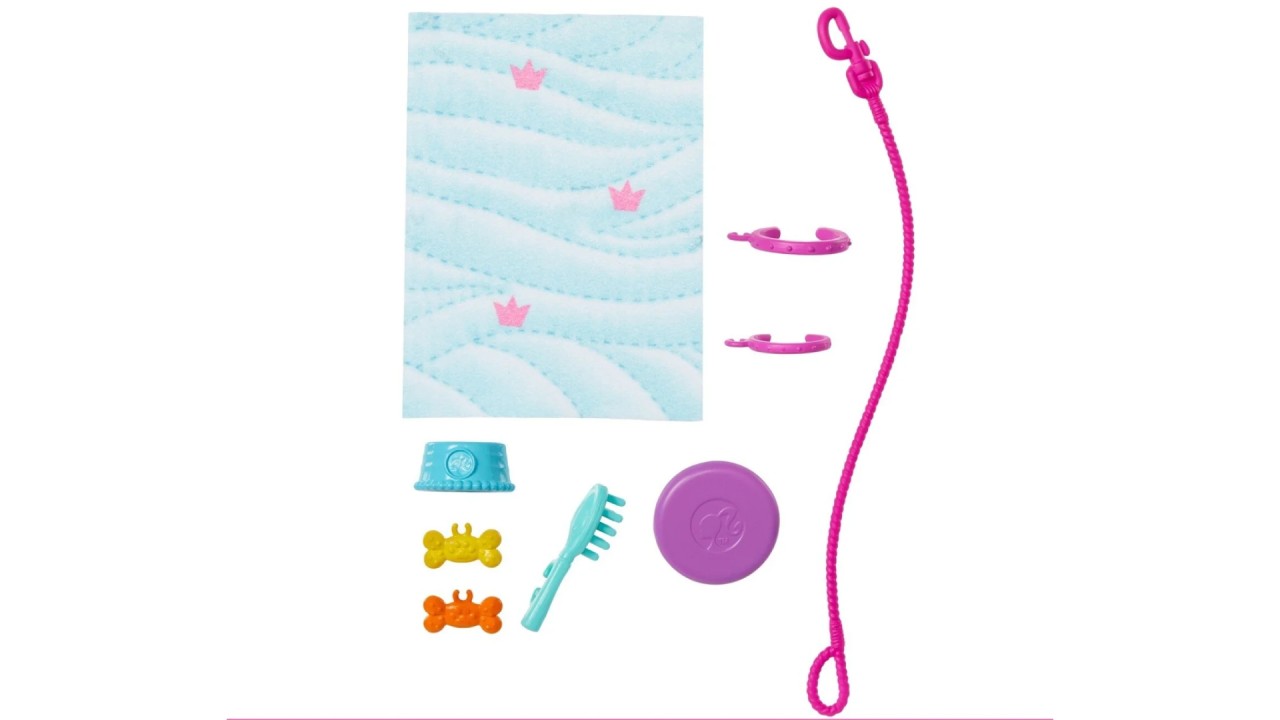 The set includes pet accessories, including a leash that can be attached to the doll's hands, a food bowl, a pet bed and delicious bone treats.