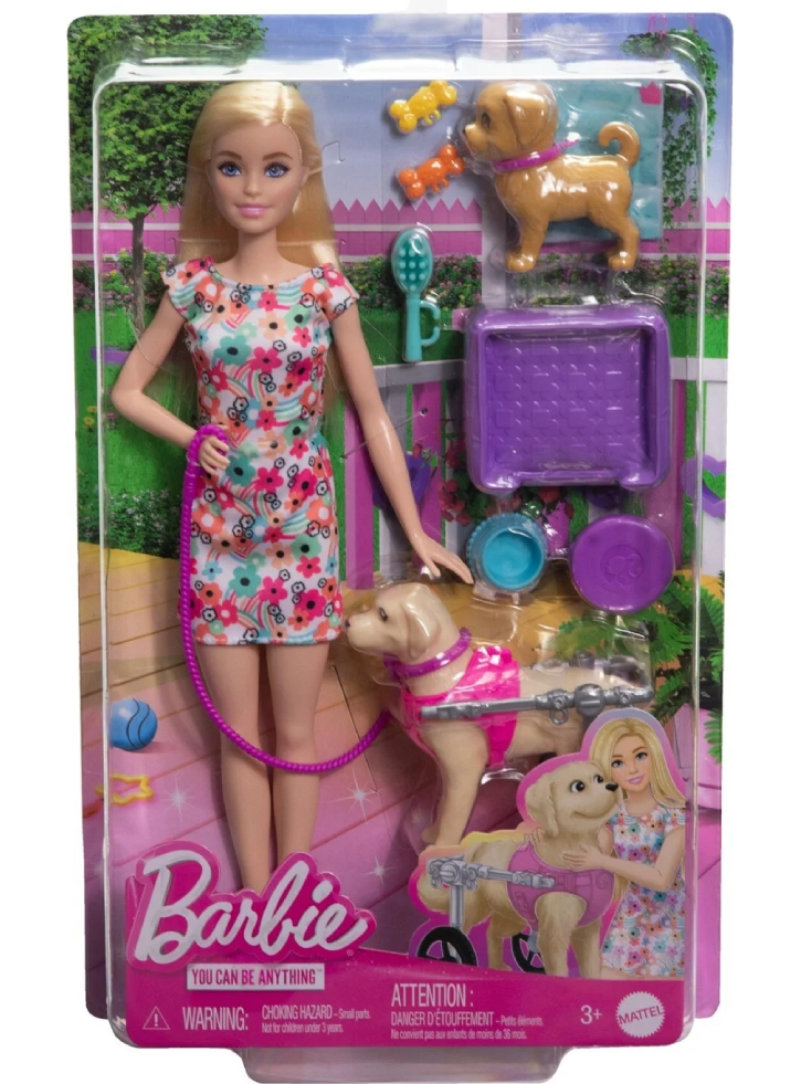 This Barbie set comes with a puppy and a large dog that has a wheelchair with working wheels!