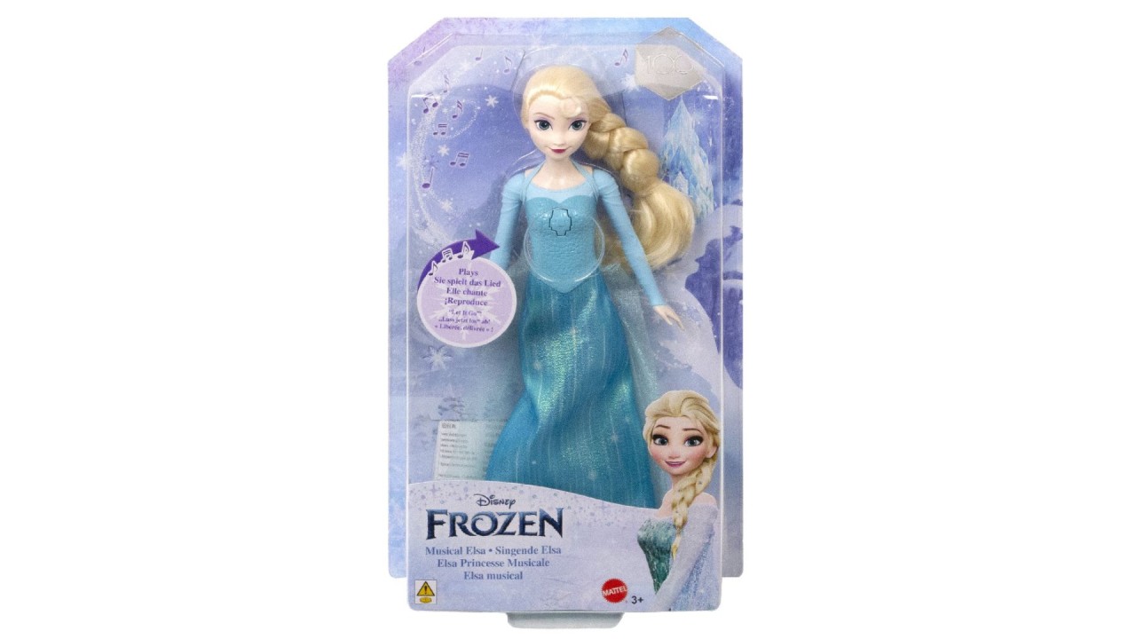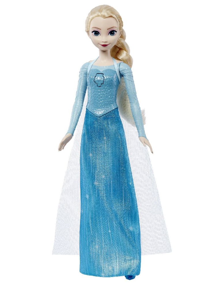Inspirată de figura animată, această păpușă Elsa cântă melodia ei celebrată din Frozen de la Disney.