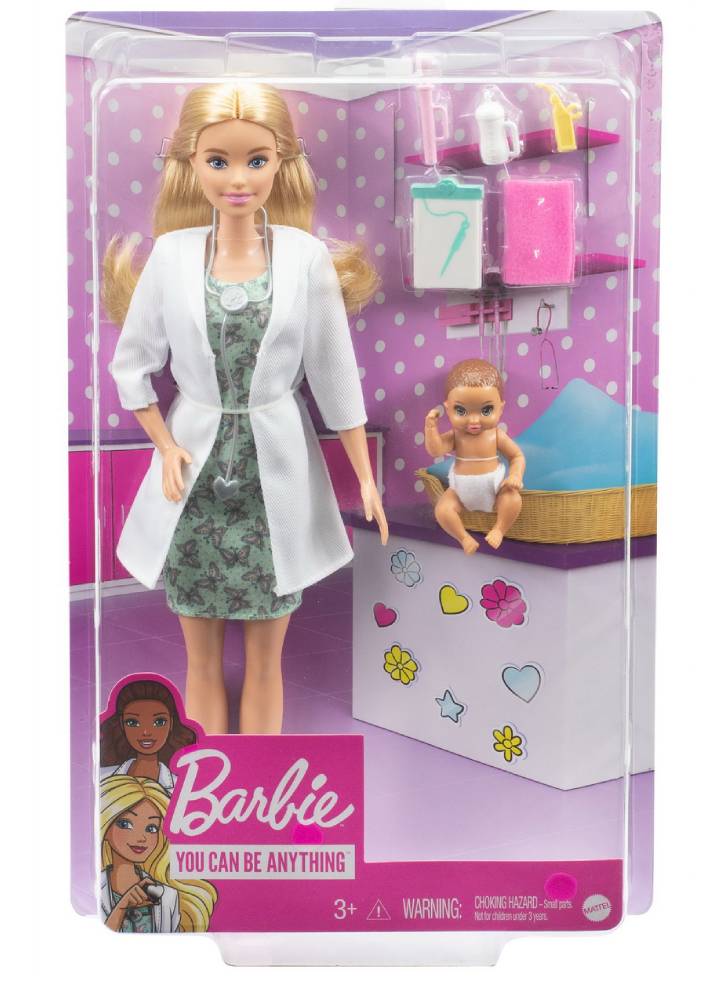 Purtând o rochie drăguță cu model fluture și o haină albă de doctor, păpușa Barbie este pregătită să aibă grijă de adorabilul ei pacient bebeluș.