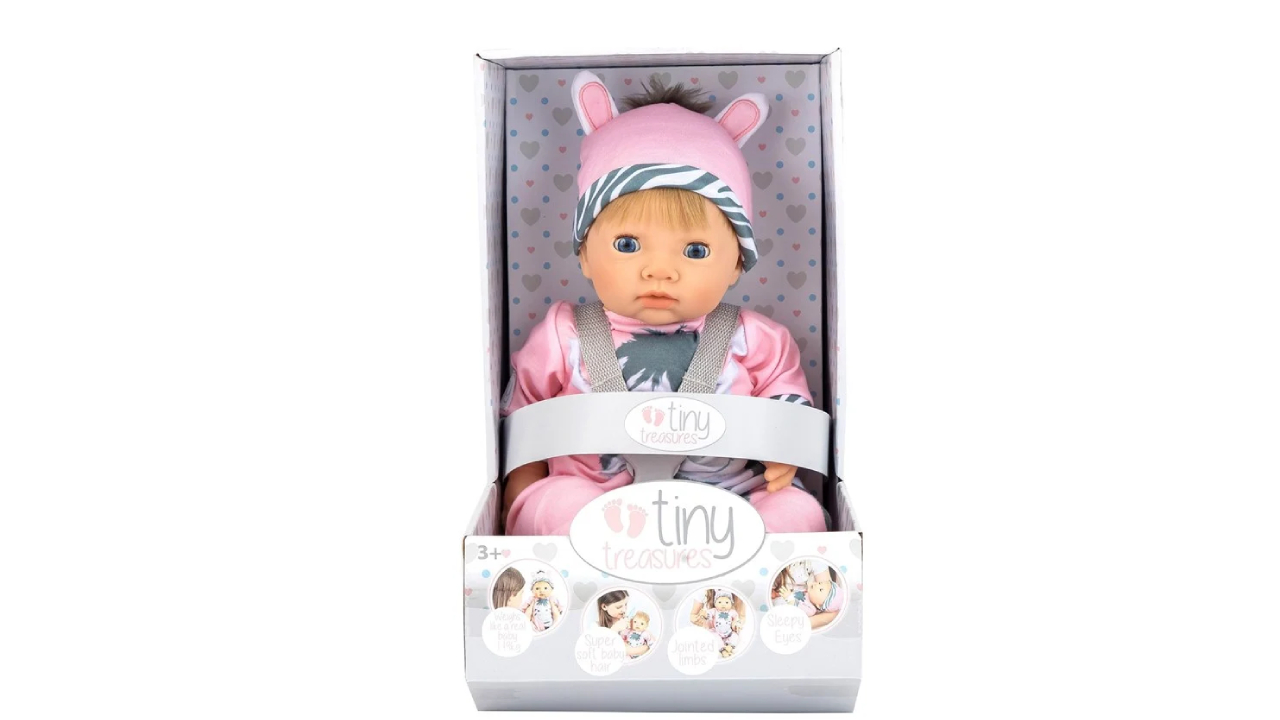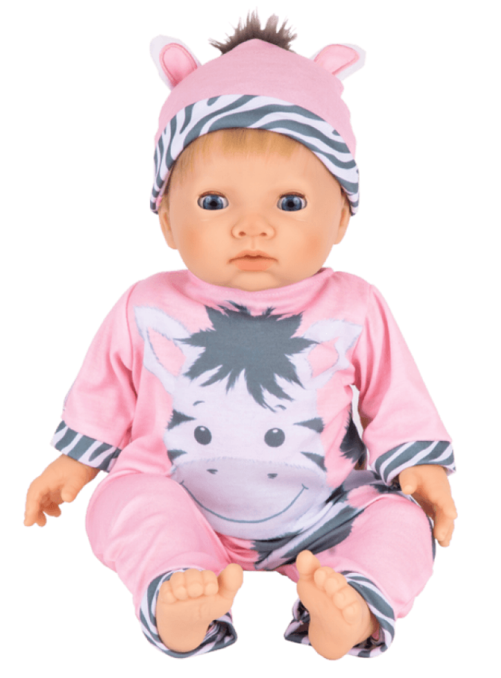 Această păpușă de bebeluș Tiny Treasures, frumos realizată, este îmbrăcată într-un costum roz cu un imprimeu drăguț de zebră și decorațiuni cu imprimeu de zebră.