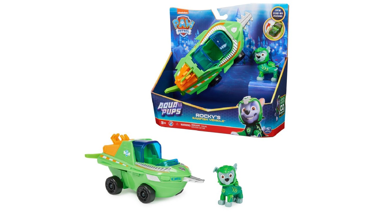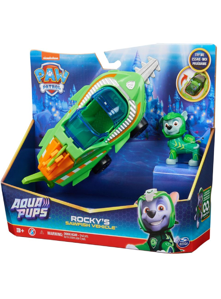 Cu costumul său verde de neopren și casca Aqua Pups, Rocky este pregătit pentru salvări supraîncărcate în oceanul prefăcut! Vehiculul Sawfish al lui Rocky are o transformare interesantă.