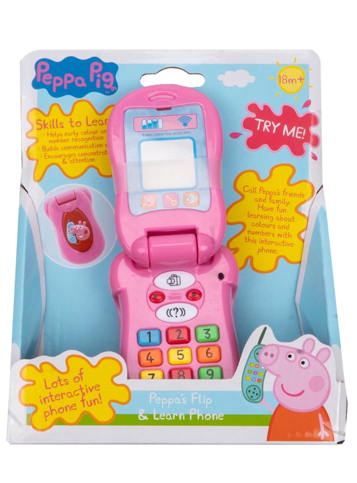 Telefonul mobil poate fi pliat și deschis. Copiii pot învăța despre culori și numere cu acest telefon viu colorat Peppa Pig de la Early Learning Centre.