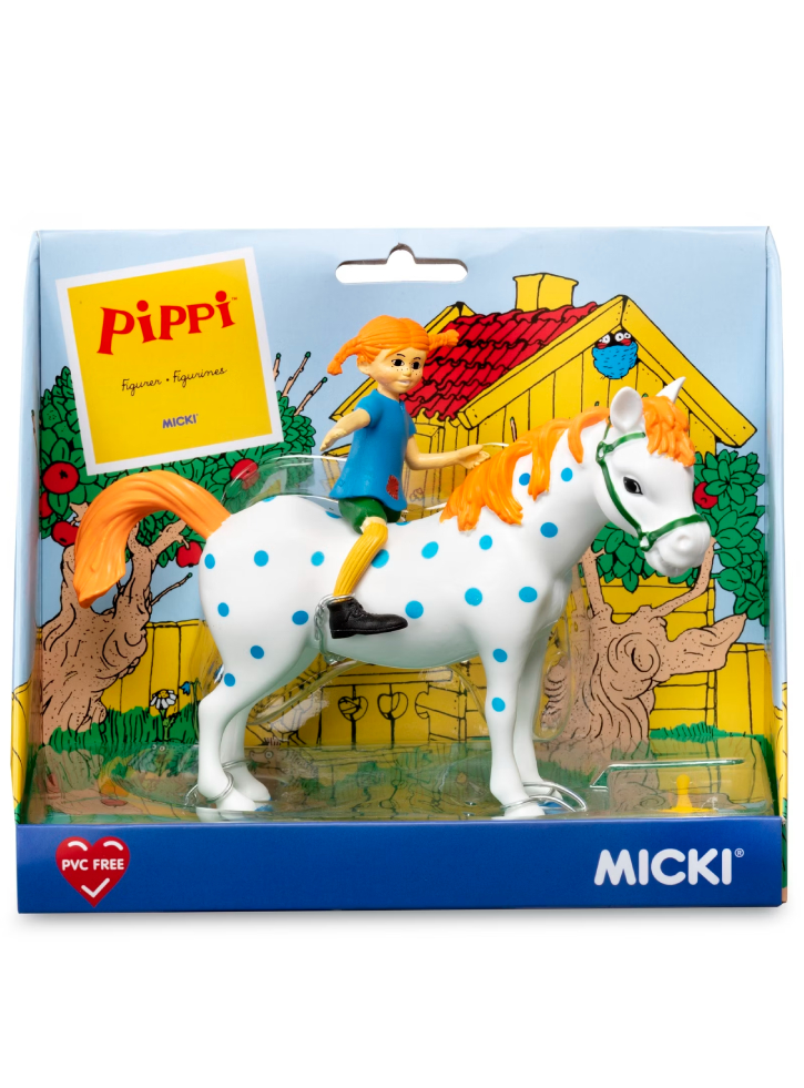 Figurina Pippi este realizată cu detalii deosebite, reflectând aspectul său caracteristic: roșcată cu codițe împletite, haine colorate și zâmbetul său vesel.