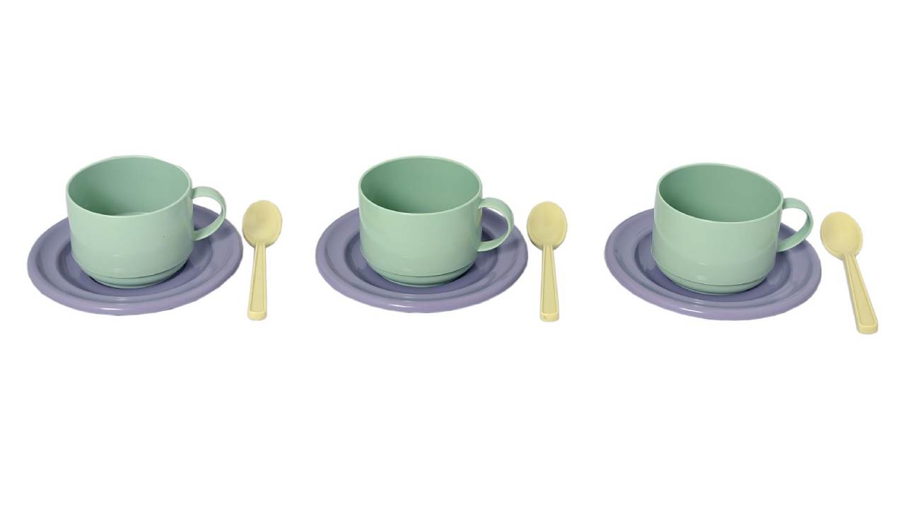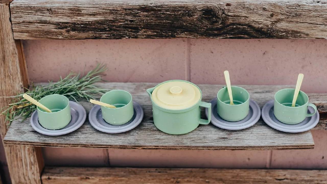 Setul de veselă de cafea Plasto pentru patru persoane este un plus ecologic pentru joaca de acasă.
