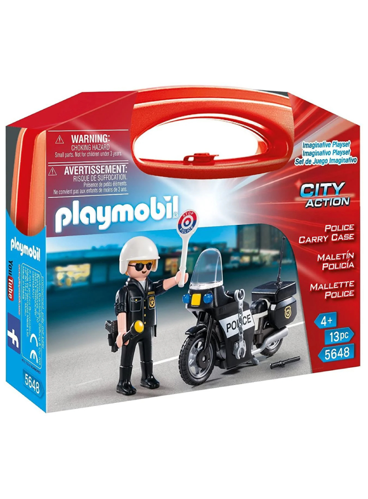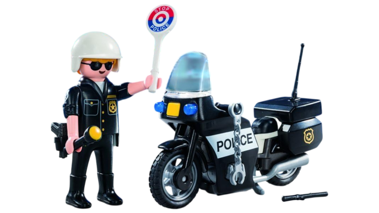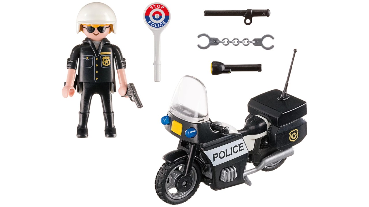 The set includes a police figurine, motorcycle, helmet, police sign, flashlight and additional accessories.