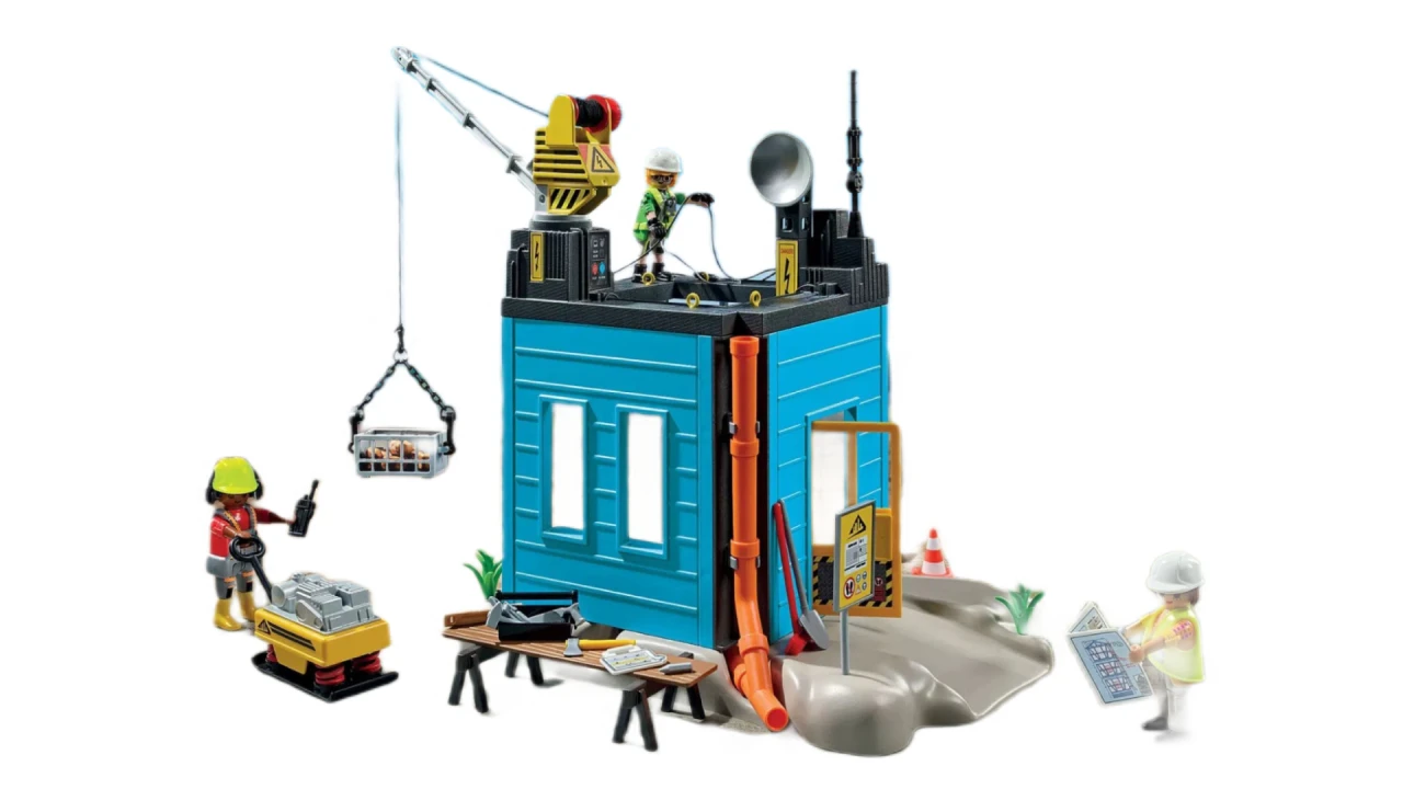 Eșafodajul cu grinzi de oțel este deja montat, iar acum tehnicianul electronist instalează cablul pe acoperiș.