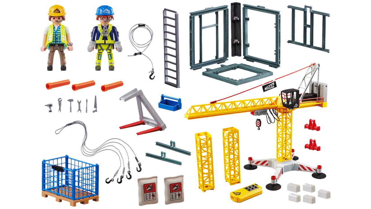 Macaraua Playmobil și buldozerul sunt, de asemenea, gata de utilizare pentru a construi noua casă înaltă în cel mai scurt timp.