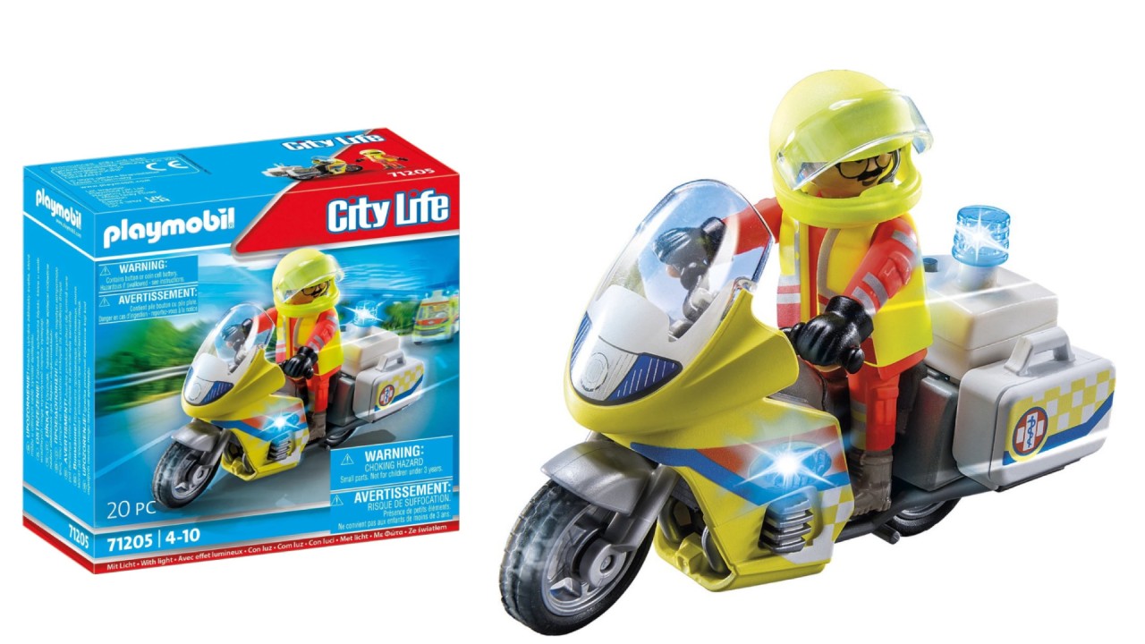 The Playmobil emergency doctor on a motorcycle is the first to appear on the scene in the event of an accident.