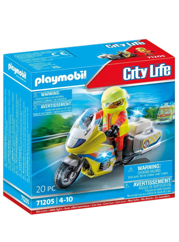 The Playmobil motorcycle emergency doctor is equipped with a helmet, gloves and a first aid kit.