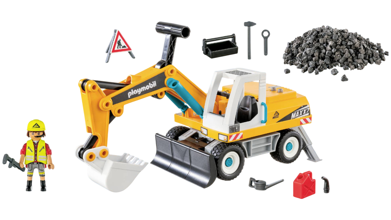 Ajutați-l pe muncitorul în construcții cu noul excavator PLAYMOBIL cu cabină pentru șofer, lopată mare, mâner pentru deplasarea lopatei în sus și în jos și o lopată suplimentară pentru lucrările la sol pe șantier.